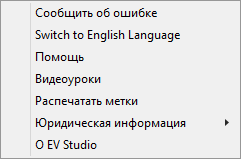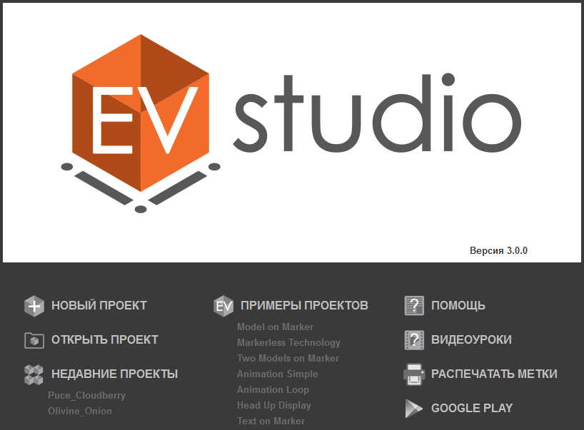 Экран который появляется при запуске приложения EV Studio со списком основных действий.