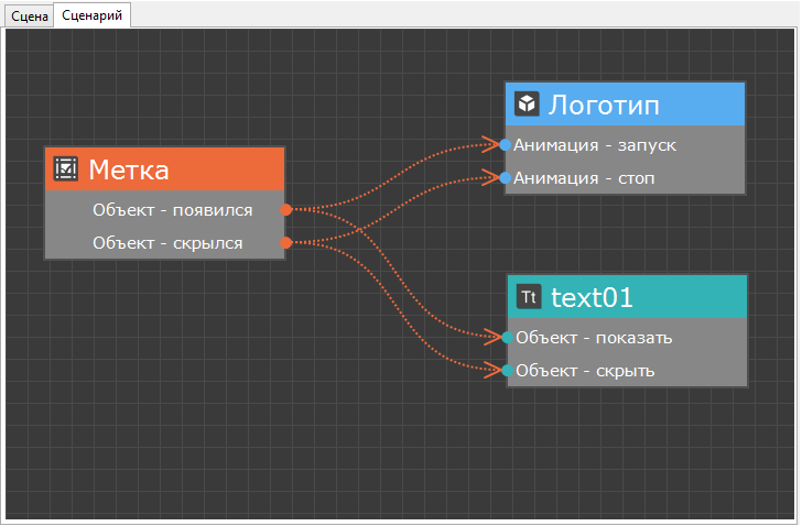 Во вкладке «Сценарий» отображается схема взаимодействия событий и действий объектов. Чтобы создать новый блок нажмите правую кнопку мыши и выбирете объект. Чтобы добавить в блок событие или действие нажмите правую кнопку мыши на блоке и выберите событие или действие из списка. Чтобы соединить событие с действием нажмите дважды левой кнопкой мыши на кружочек справа от события и протяните линию до нужного вам действия. Подробнее о создании и редактировании сценария презентации можно узнать в разделе Сценарий.