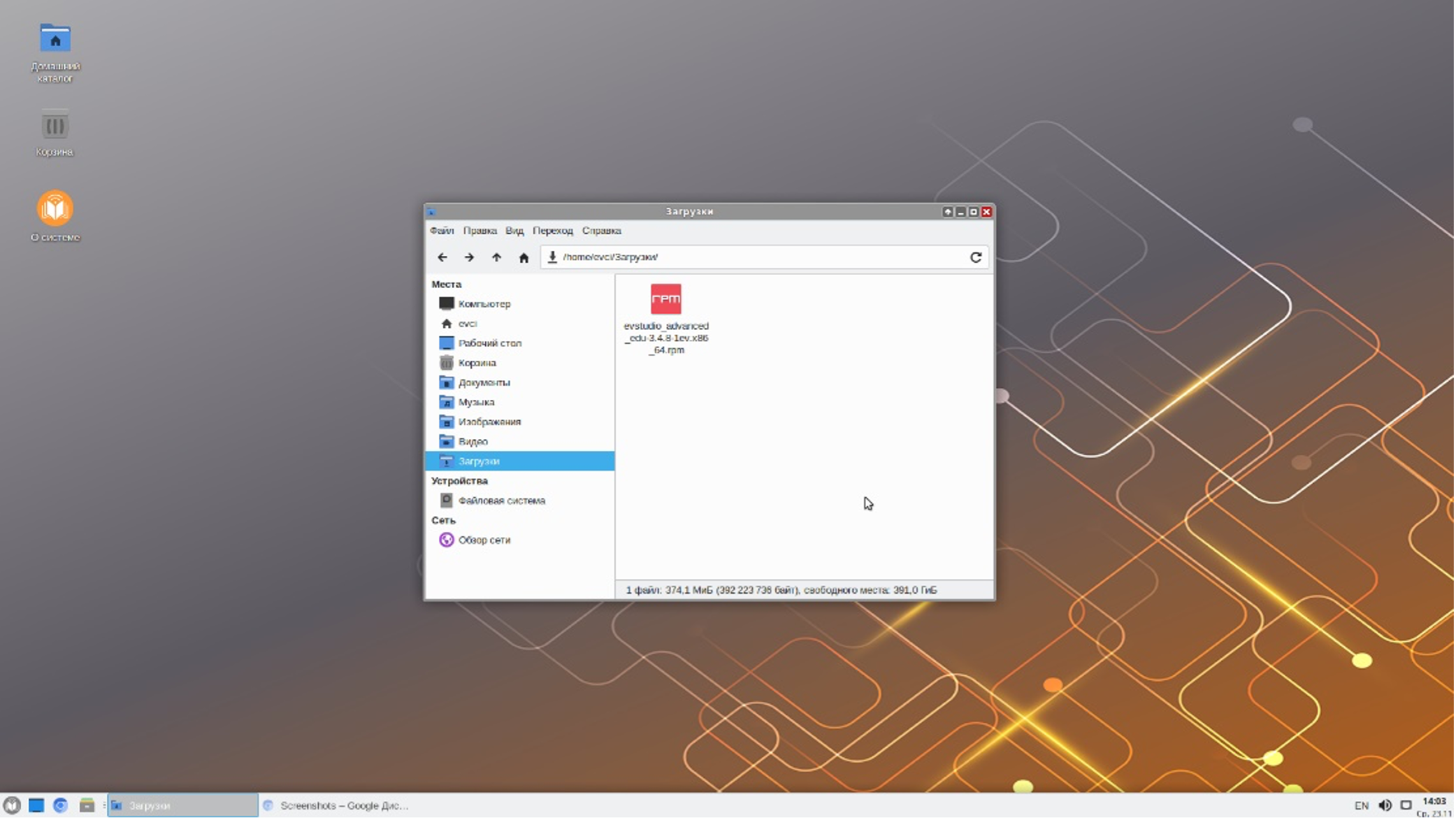 Выберите необходимую вам версию, загрузите дистрибутив evstudio_xxx_xxx-3.5.х-1ev.x86_64.rpm и сохраните его в удобной для вас папке, например /home/Имя пользователя/Загрузки (/home/Имя пользователя/downloads). После загрузки в папке будет сохранен дистрибутив в формате *.rpm