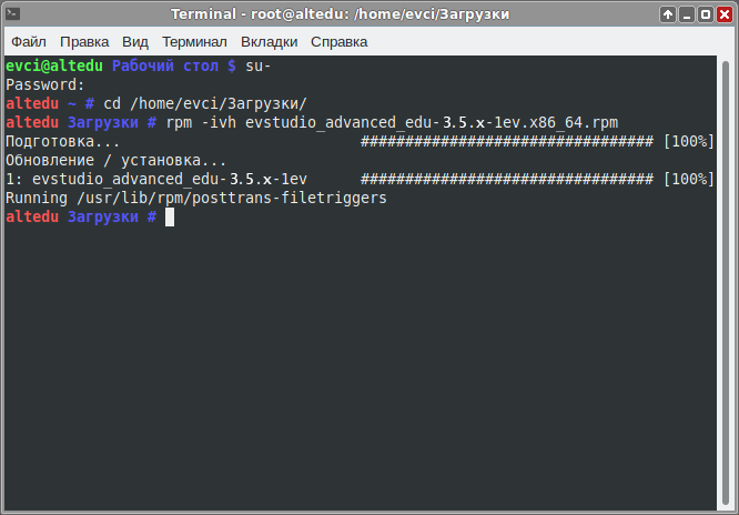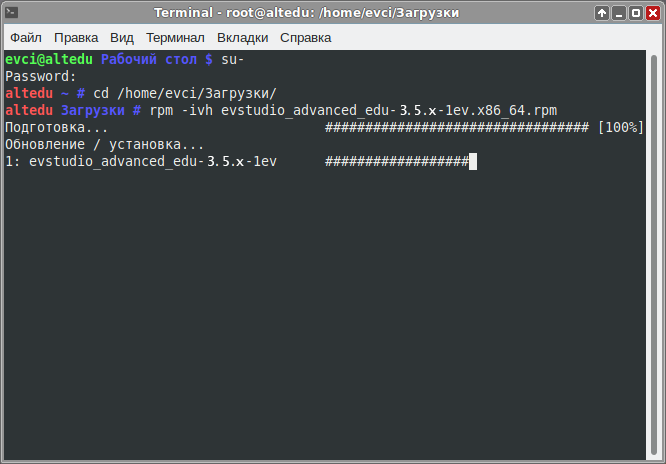 С помощью команды сd перейдите в терминале в локальную папку, где был сохранен пакет evstudio_xxx_xxx-3.5.х-1ev.x86_64.rpm