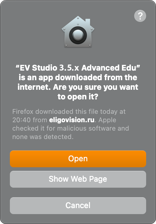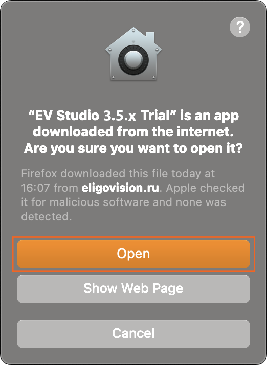 После установки программы вы можете запустить конструктор EV Toolbox на вашем Mac. При первом запуске программы ОС предупредит о том, что программа была загружена из сети Интернет и спросит действительно ли вы хотите открыть программу. Необходимо нажать “Open” для запуска конструктора.