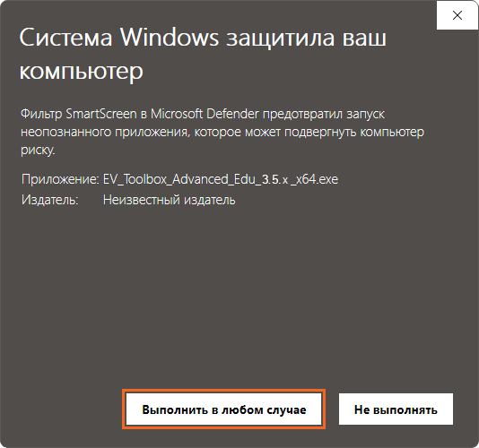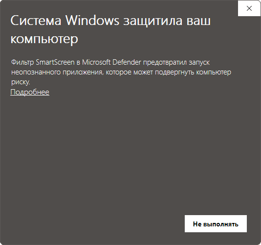 При установке программы на ОС Windows Защитник Windows покажет стандартное при установке неподписанных программ окно предупреждения. Для продолжения запуска программы установки необходимо нажать “Подробнее” > “Выполнить в любом случае”.