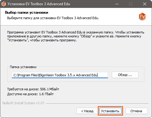 По умолчанию установка осуществляется в новую созданную директорию на диске C:\Program Files\EligoVision Toolbox 3.5.x...