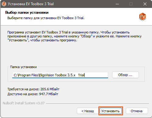 По умолчанию установка осуществляется в новую созданную директорию на диске C:\Program Files\EligoVision Toolbox 3.5.x Trial