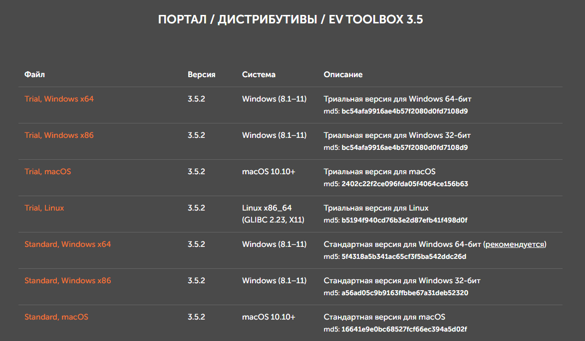 Выберите необходимую вам версию и загрузите установочный файл: EV_Toolbox_…_…_3.5.x_x64.exe, EV_Toolbox_…_…_3.5.x_x86.exe