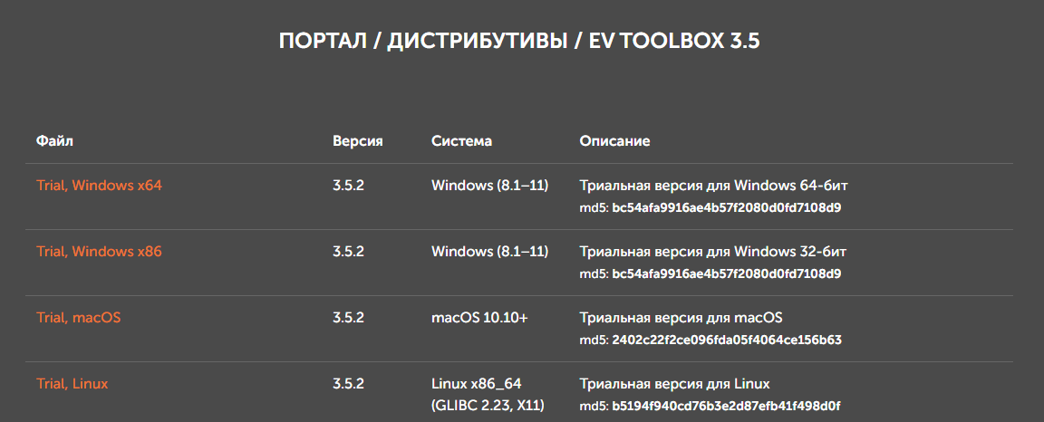 Для новых пользователей на внутреннем портале для загрузки по умолчанию доступны только пробные версии конструктора EV Toolbox нескольких версий для различных операционных систем.