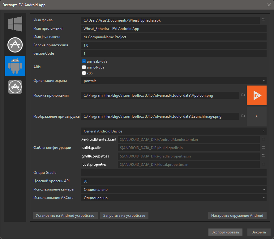 С помощью конструктора EV Toolbox вы можете собрать приложение под мобильную операционную систему Android. Чтобы экспортировать проект в виде Android-приложения в формате .apk/.aab, откройте диалог экспорта и в панели слева выберите Android в качестве целевой платформы. Откроется список параметров будущего приложения.