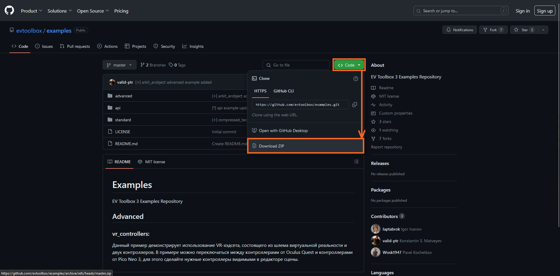 Пример базового проекта video360 можно загрузить через веб-сервис для хостинга IT-проектов и их совместной разработки GitHub в репозитории evtoolbox. Данный проект можно использовать в качестве основы при разработке проектов с использованием видео и фотопанорам формата 360°.