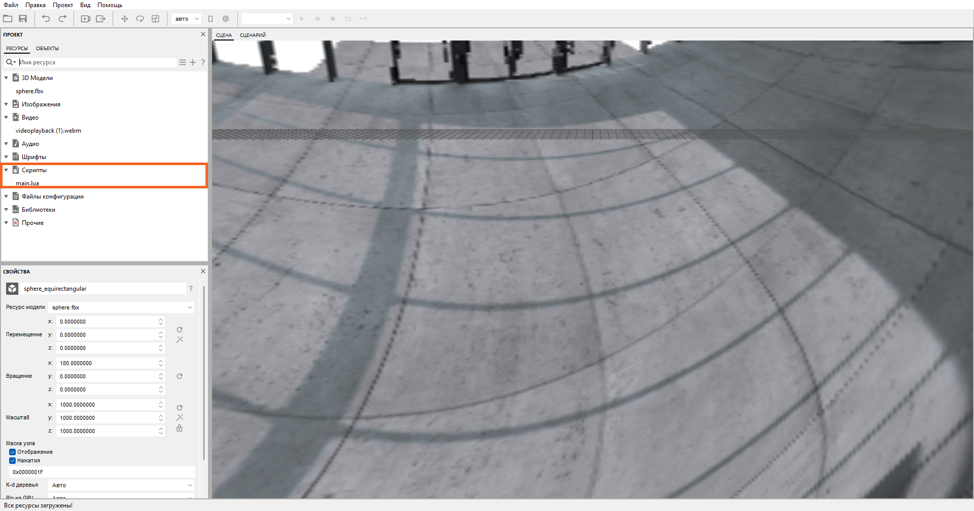 Наложение видео формата 360° или фотопанорам на внутреннюю поверхность сферы осуществляется с использованием скрипта на языке Lua. Скрипт позволяет определить корректные координаты наложения видео или фотопанорамы на геометрию сферы.