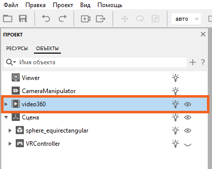 Для использования в проекте видео 360 или фотопанорама должны быть добавлены как объекты проекта: объект Видео (VideoReactor) для видео 360 и объект Изображение (ImageReactor) для использования фотопанорамы на сфере соответственно. Такие объекты должны быть размещены вне сцены проекта (объекты не являются дочерними объектами объекта Сцена (SceneReactor))